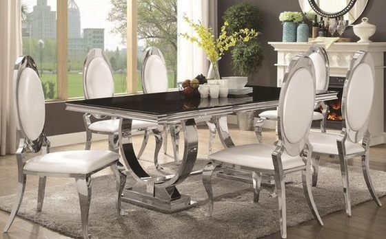 La mesa de comedor está principalmente de diseño simple, conveniente para la compra en el hogar. El estilo simple es durable, no el color de la flor, sino la plata de acero inoxidable clásica como el color principal. El tablero de la mesa puede elegir utilizar el mármol o el panel del MDF. Este estilo ha sido comprado siempre en grandes cantidades por los distribuidores autorizados importantes de los muebles.