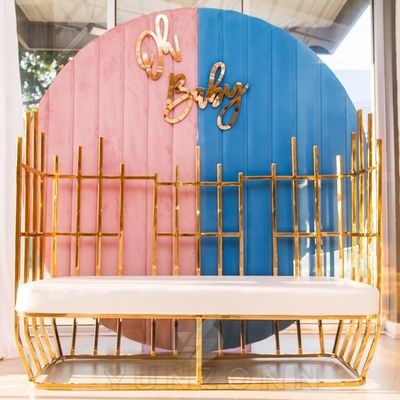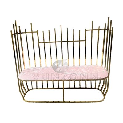Un sofá de boda de alta calidad con respaldo largo y acabado dorado, con un llamativo diseño de púas y tapicería de PU de lujo con estructura de acero inoxidable.