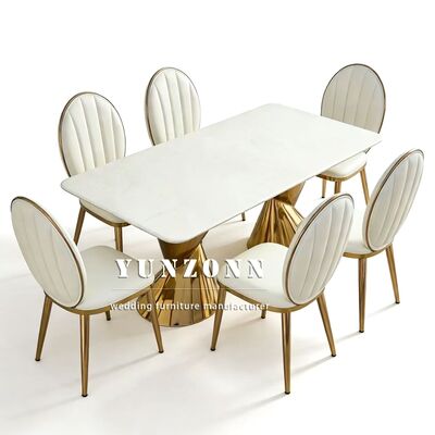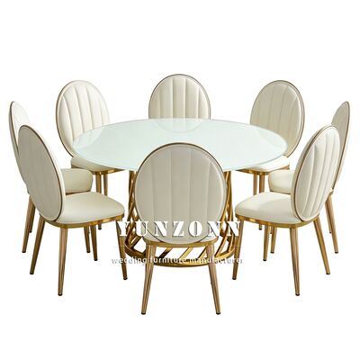 P3: ¿Cuál es el material de sus productos? A3: Marco de acero inoxidable para mesa y silla, vidrio templado en la mesa; mármol o madera. Los cojines de las sillas están hechos de esponjas de alta densidad y cuero o tela de alta calidad.