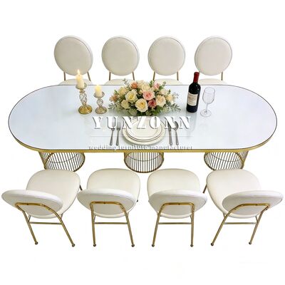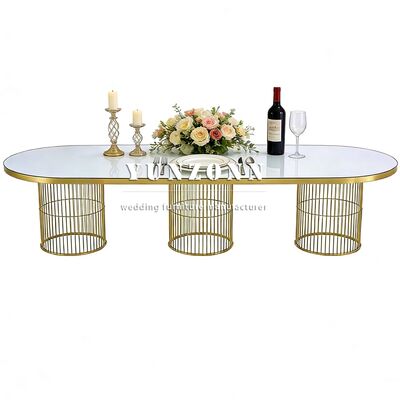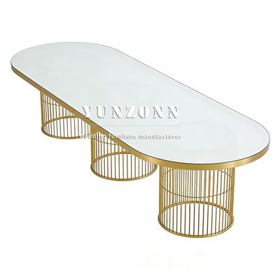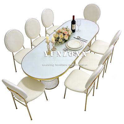 | Nombre del producto: | Nuevo estilo evento banquete mesa de comedor de forma ovalada piernas de acero de oro sala de cena mesa de bodas para la decoración del evento |