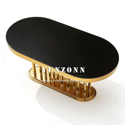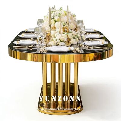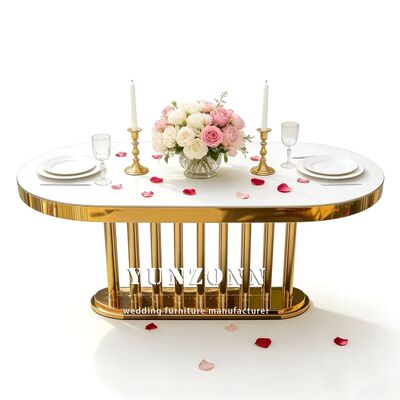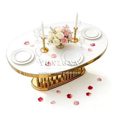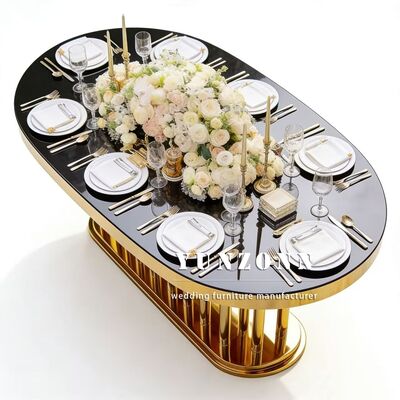 | Nombre del producto: | Muebles de bodas mayoristas de oro oval marco de acero inoxidable espejo blanco vidrio de la parte superior de la mesa larga mesa de comedor hotel para la boda |