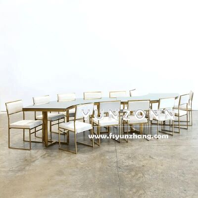P3: ¿Cuál es el material de sus productos? R3: Las mesas y sillas están hechas de marco de acero inoxidable, vidrio endurecido o mármol o mdf en la superficie de la mesa, que depende de su elección.Los cojines de las sillas están hechos de esponjas de alta densidad y cuero o tela de alta calidad.